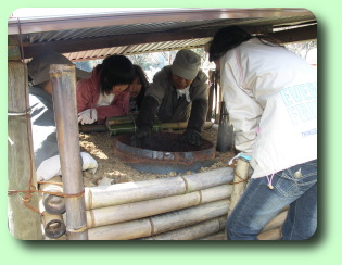 今回は小型のドラム缶タイプの窯で焼くことにします。切った竹を割って、いくつもの束を作ります。それを窯の中に隙間なく詰めていきます。一杯になったら、窯にフタをして上から土をかぶせておきます。次回第9回ではできあがった炭を取り出します。